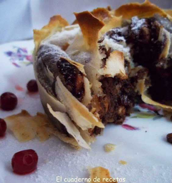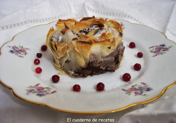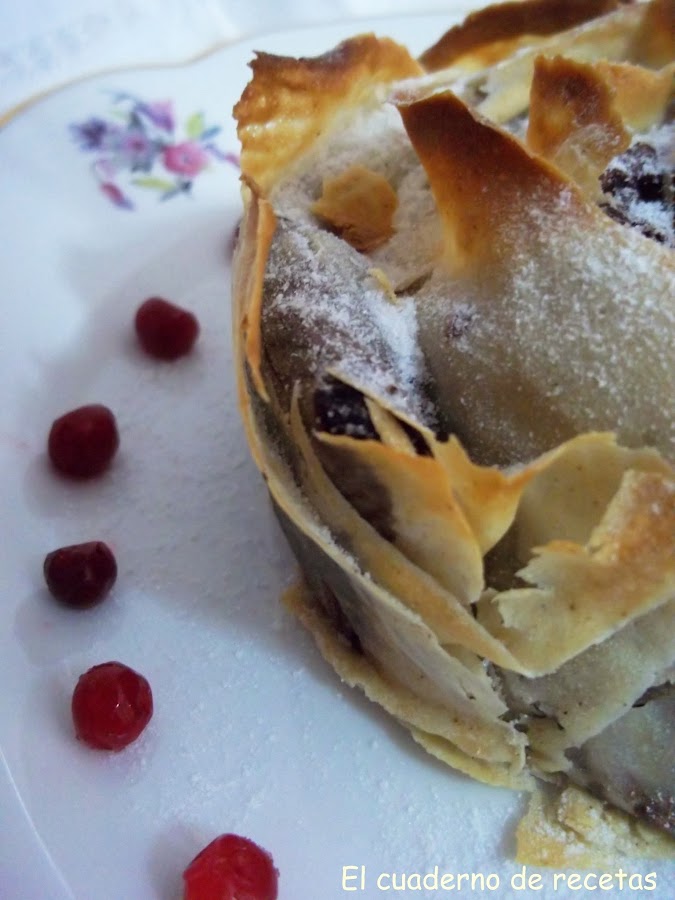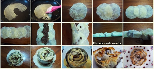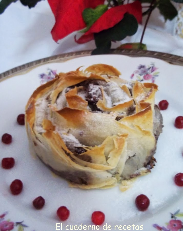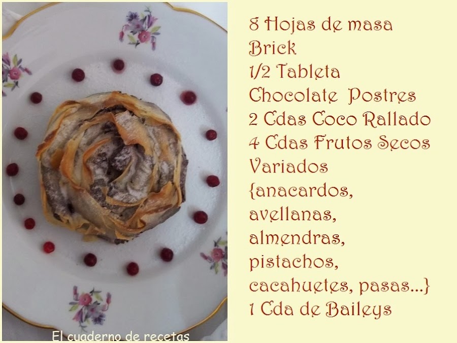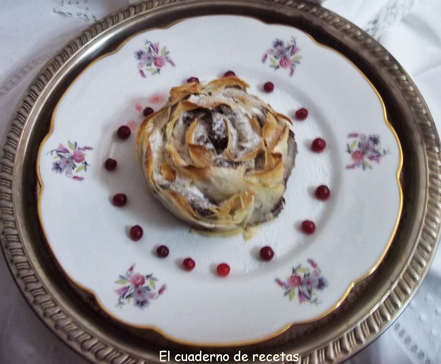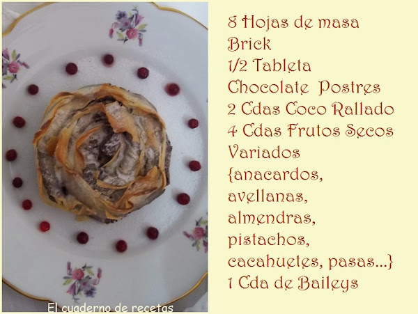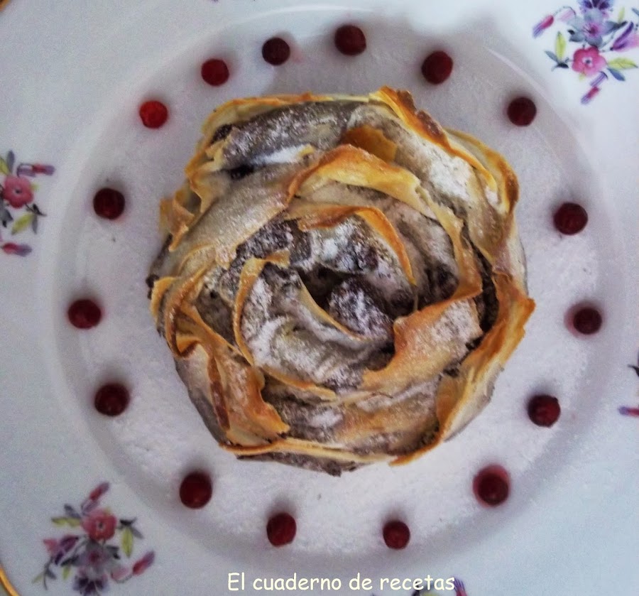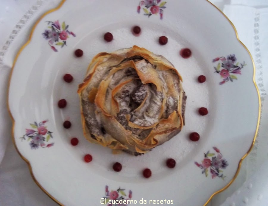 Hoy quería enseñaros un pastel muy rico, facilísimo y que hará las delicias de los golosos. La combinación crujiente con la masa brick, es todo un acierto, queda muy elegantón y se puede hacer en dos fases para esos días de fiesta que estan por llegar, que vamos más apurados de tiempo. Dejamos la rosa formada por la mañana y bien tapada, en los entrantes la metemos al horno, cuando empecemos el primer plato, la sacamos del horno....y para los postres estará templada, justo para darle un golpe de azúcar glass y montarla en el plato.