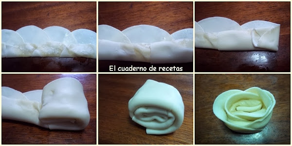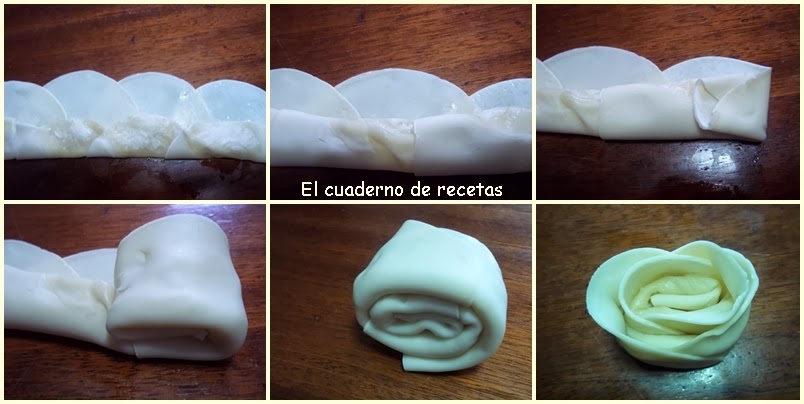 Hacemos las hojas de masa brick, o utilizamos las compradas, aunque tendremos que cortarlas o haremos una rosa gigante, eso ya va en gustos.