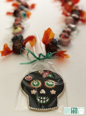 Es por lo que yo he hecho este rosario que muy bien podéis hacer en familia, tan solo tenéis que haceros con las golosinas que mas os gusten, en mi caso elegí unas nubes negras, calabazas de azúcar, ojos ensangrentados, las compré en Snack Market que tienen una enorme variedad tanto en decoración como en golosinas para preparar nuestra monstruosa fiesta. La patena podéis hacerla con chocolate, pero como ya sabéis lo que me gusta decorar galletas, yo hice una galleta calavera decorada.