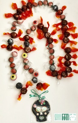 La elaboración es taaaan sencilla, recortar cuadrados de papel celofán e ir envolviendo las golosinas como si fueran caramelos, ensartarlos formando un collar y listo!