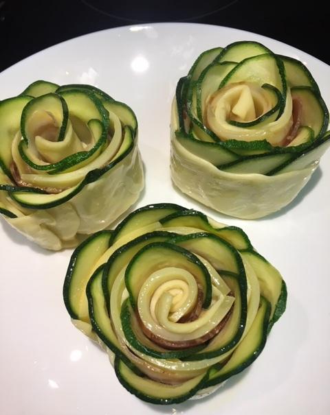 Hace poco asistí a un taller en el que nos mostraba como hacer platos diferentes con hojaldre y carne picada. Yo he tomado la base y la he adaptado a lo que yo tenía en ese momento en la nevera y el resultado han sido estas rosas de calabacin.