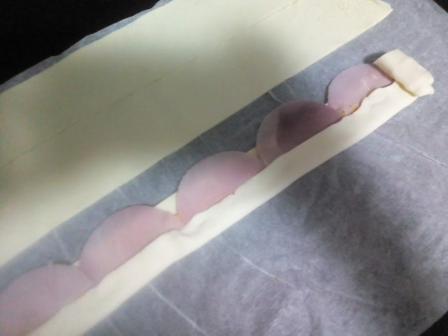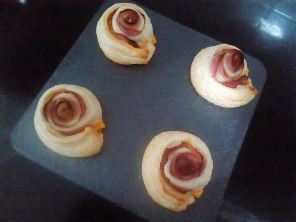 Estiramos nuestra masa de hojaldre y la cortamos en cinco franjas iguales. Ahora cortamos los tranchetes en otros cinco trozos y lo colocamos justo en el centro de cada tira de hojaldre. Con un cortador de pasta o un vaso hacemos círculos en las lonchas de jamón york, las cortamos por la mitad y las colocamos también en la tira de hojaldre de modo que el jamón sobresalga un poco, ya que serán los pétalos de nuestra rosa.