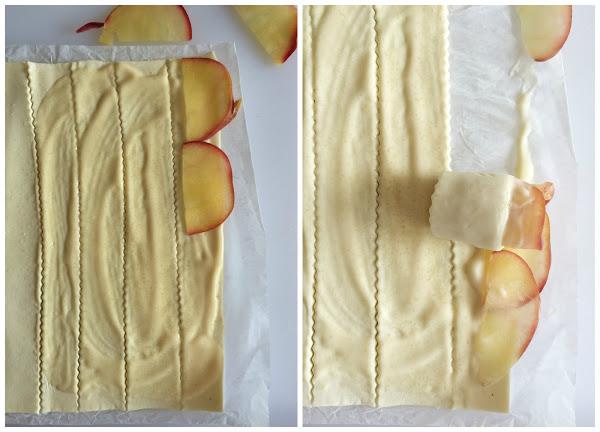 Estiramos la plancha de hojaldre, espolvoreamos con azúcar una cara, le damos la vuelta, cubrimos con una capa ligera de crema, cortamos tiras de unos 3-4cm por el lado mas corto del hojaldre y vamos colocando las laminas de manzana superponiendo una un poco encima de la otra y con la parte redondeada de la manzana que sobresalga del hojaldre, como podéis ver en la foto. Dejar el extremo del hojaldre sin manzana