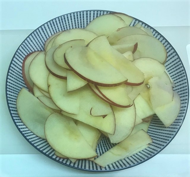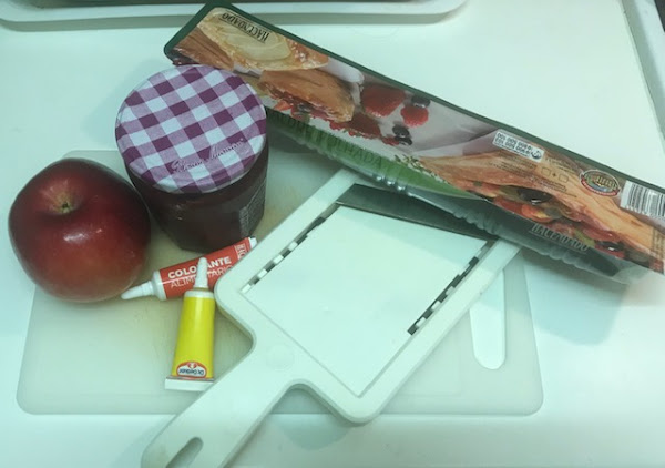 Hervir en una cazuela el agua con el zumo de limón, si las queréis teñir añadir también unas gotas de colorante alimentario, escaldar durante un minuto y escurrir, esto también lo podéis hacer en el microondas sin el colorante, simplemente las manzanas fileteadas y tapadas 2 minutos a máxima potencia, dejar enfriar.