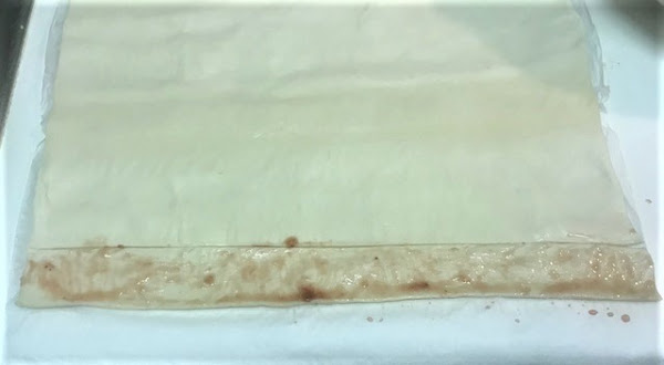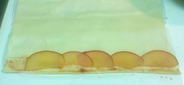 Estirar la lamina de hojaldre, cortar en tiras de 3-4 centímetros, pintar cada tira con la mermelada, poner encima los filetes de manzana y enrollar con cuidado.