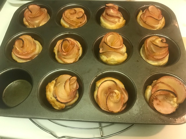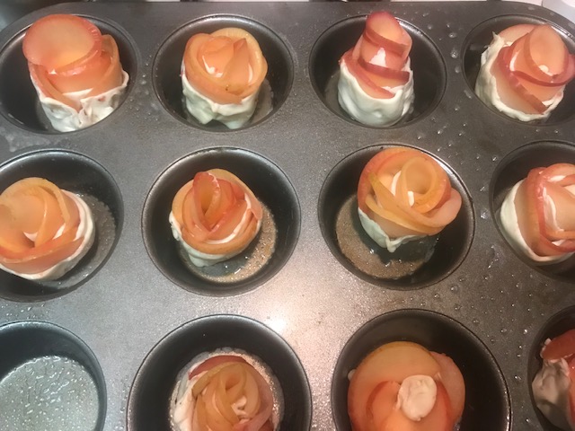 Engrasar un molde de magdalenas y colocar allí nuestras rosas ya formadas.