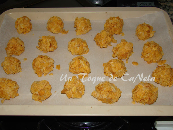 Con una cucharilla, coger una porción de masa y rebozar por los copos de maíz y formar una bola apretando un poco.