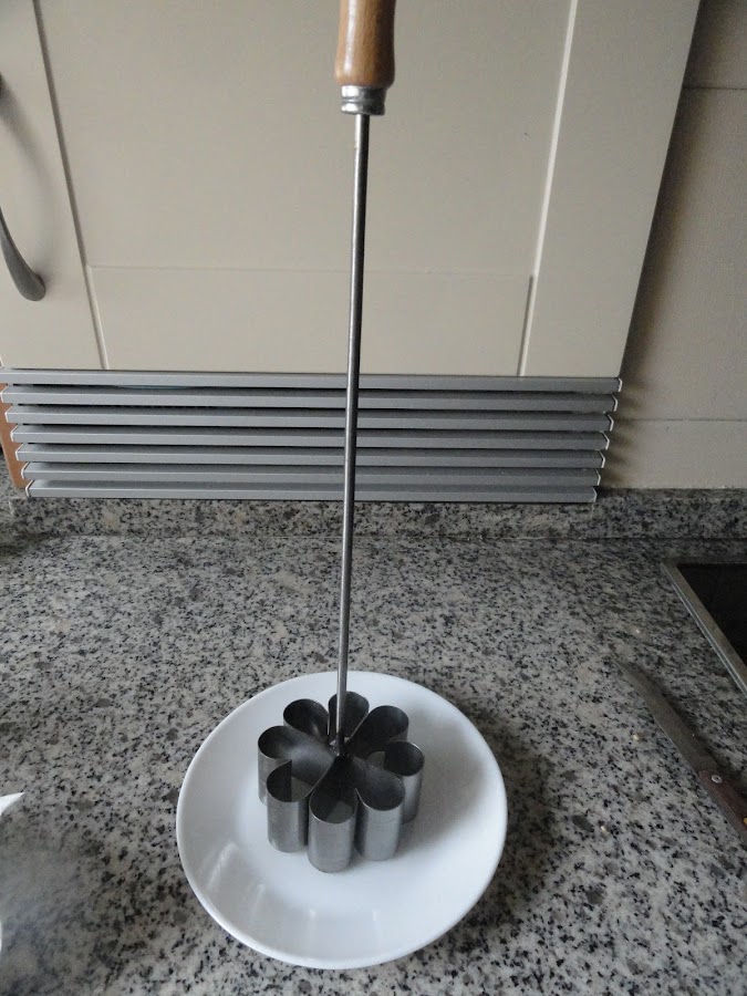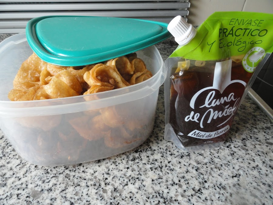 Ponemos a calentar abundante aceite de girasol en sartén o recipiente que sea hondo. En el aceite metemos el molde que se caliente, pero no demasiado que entonces la masa se solidifica al meter el molde en el bol. Vamos metiendo el molde sin cubrirlo totalmente, que quede como un centímetro sin mojar en la masa, y metemos en el aceite, se suelta sólo y se fríen muy rápido. Damos la cuelta y apartamos y ya sólo nos queda cubrir de azúcar y canela o sólo azúcar o con miel previamente calentada y diluida en un poquito de agua.Yo he utilizado la miel que incluye este mes la caja DISFRUTABOX, miel de flores de la marca LUNA DE MIEL, con un envase muy práctico. El rebozado ya al gusto. También en la masa se puede agregar esencia de vainilla que le aporta un sabor y aroma muy rico. El molde lo venden en ferreterías, los hay de hierro y de acero inoxidable, el mio es de hierro y va muy bien, no se pega la masa.