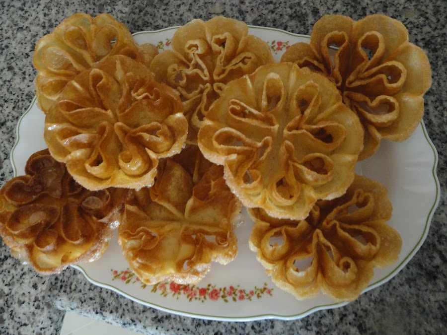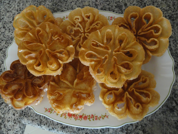 En algunos lugares se conocen como flores y en otros como rosas. Son unos dulces muy, muy ligeros, y crujientes, muy ricos y fáciles de preparar. Sólo necesitamos: