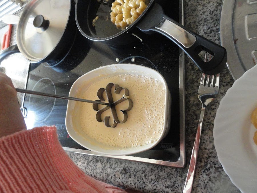 Batimos los huevos (yo he hecho seis y casi tengo que poner un puestecillo de dulces porque salen muchos). Lo que midan los huevos, esa misma cantidad menos un dedo de agua, y la misma cantidad de harina (yo tuve que agregar un poco más de harina porque, aunque la masa es liquidita, quedó demasiado líquida y no se agarraba bien al molde). Mezclamos todo muy bien, que no queden grumos.