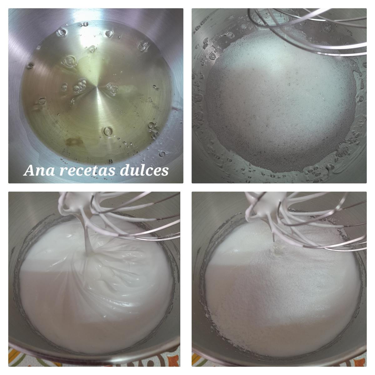 Batimos las claras a velocidad media alta, cuando empiecen a hacer espuma empezamos a incorporar el azúcar blanco poco a poco y cuando veamos que estén a medio montar, añadimos el azúcar glas y el cremor tártaro tamisados, batimos a velocidad alta hasta que el merengue esté firme y haga picos duros.