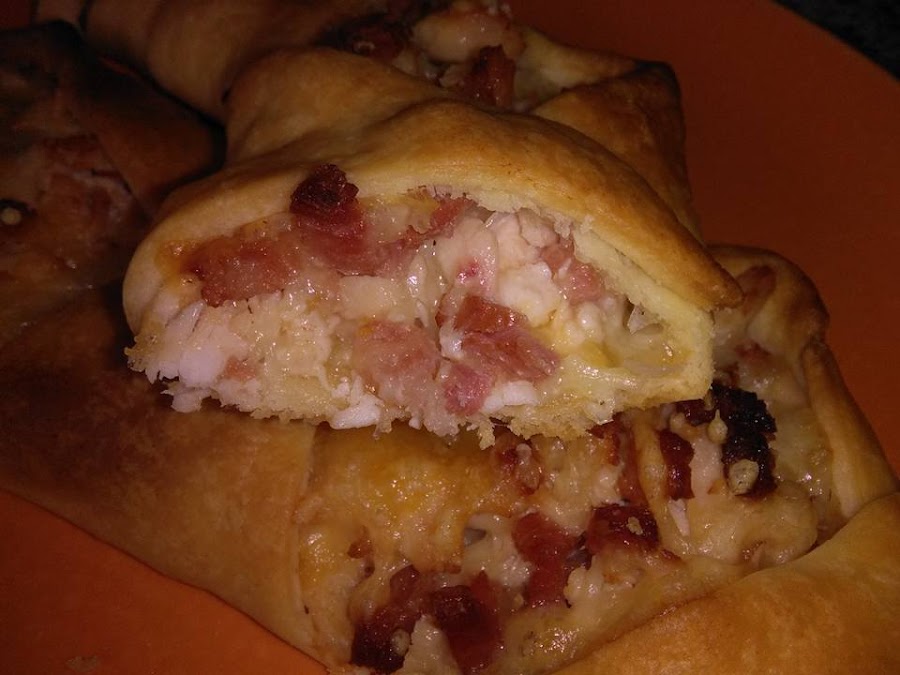 Poner el queso y el beicon, tapar como en la foto, barnizar con el huevo e introducir en el horno a 200º hasta que se vea doradito (15-20 minutos).