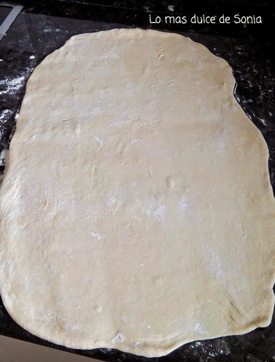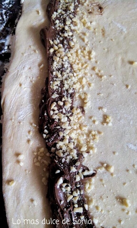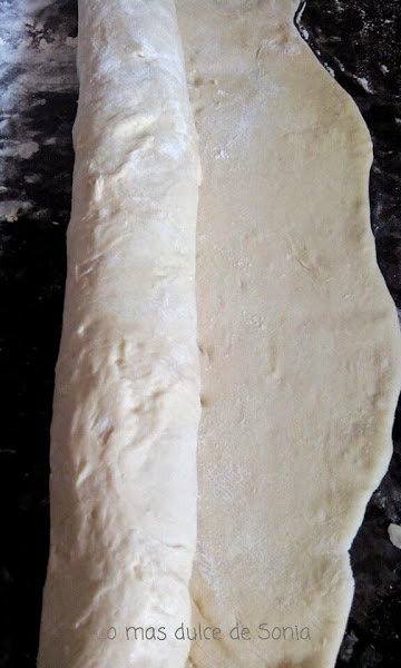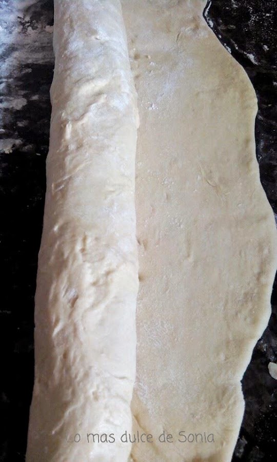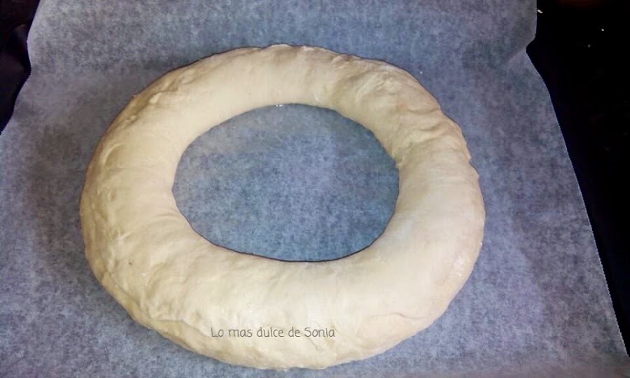 Espolvoreamos la superficie de trabajo, echamos la masa. La amasamos ligeramente y le damos forma de rectángulo. Ponemos el relleno formando un cordón a lo largo de uno de los laterales de la masa y la enrollamos. Unimos los dos extremos del rollo metiendo una dentro de otro para formar la rosca.