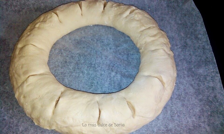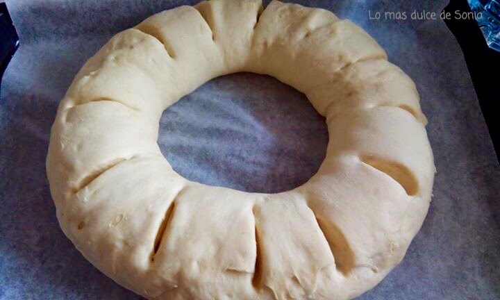 Ponemos la rosca en una bandeja forrada con papel de hornear. Hacemos 12 cortes con unas tijeras o cuchillo, cada 4-5 cm. Dejamos reposar hasta que doble el tamaño, unos 40 minutos.