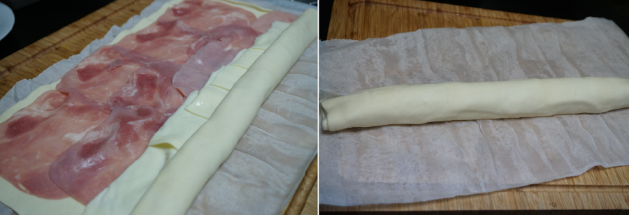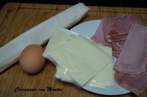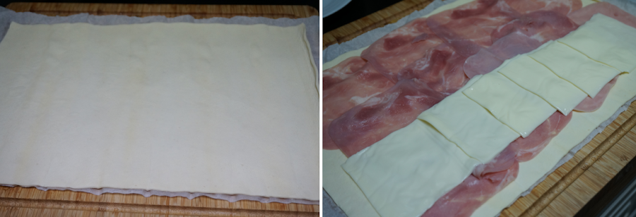 Extendemos el hojaldre sobre el papel que lleva. Cubrimos la masa con el jamón dulce y el queso. Yo solo pongo una fila de queso, se puede poner toda una capa encima del jamón.