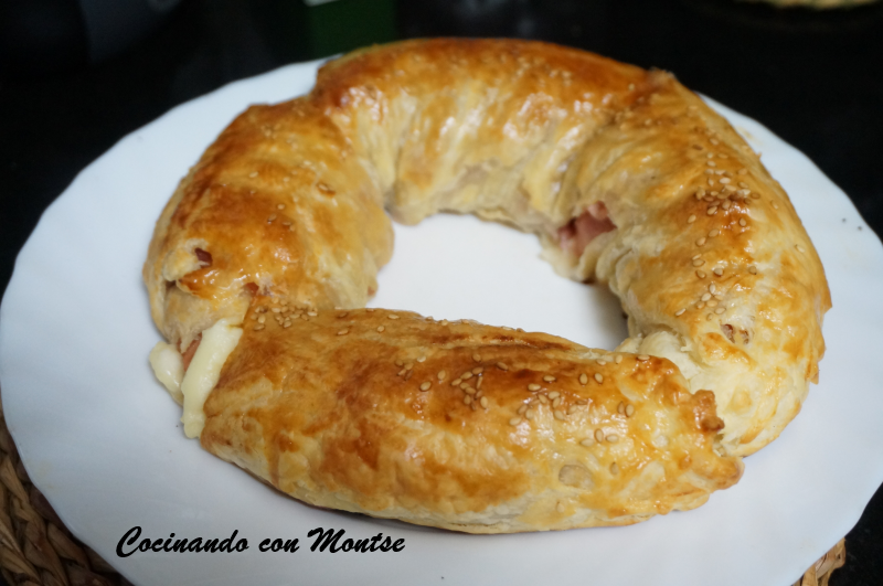 Rosca de hojaldre de jamón y queso, un delicioso roscón para sorprender a los amigos o la familia en una cena informal.