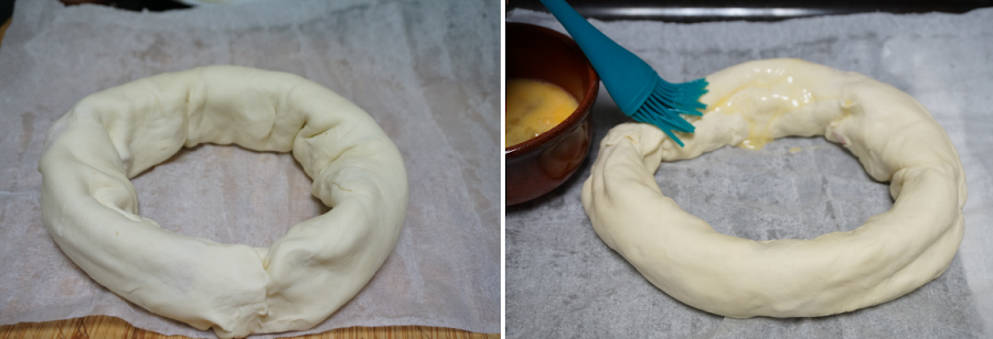Formamos un circulo con el rollo de hojaldre con cuidado y unimos los bordes. Batimos el huevo y pintamos con ayuda de una brocha la rosca.