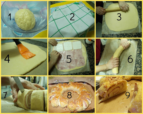 En un bol ponemos la mantequilla derretida, las 3 yemas, la leche tibia, la sal, la harina y la levadura. Removemos y amasamos, hacemos una bola y la pincelamos con un poquito de aceite, la ponemos en el bol y la tapamos con un paño de algodón. Pasada una hora, con el rodillo la amasamos en una hoja de papel de horno, haciendo un rectángulo, pincelamos con mantequilla derretida, y extendemos las lonchas de jamón york y encima las lonchas de queso, que no sea de fundir, pero que no sea duro, un queso semi. Enrrollamos con cuidado, y para que no nos quede muy grueso, con las manos vamos apretando con cuidado para hacerlo más delgado. Cortamos en porciones sin llegar a cortarlos del todo, tapamos con el paño de algodón y dejamos reposar una hora. Pasado este rato, pincelamos con la clara, y por encima yo le he puesto queso rralado manchego que tengo por casa y que cualquier excusa es buena para usarlo jeje... Precalentamos el horno a 210 grados calor arriba y abajo, introducimos la rosca y tarda aproximadamente 45- 50 minutos. Riquísima.