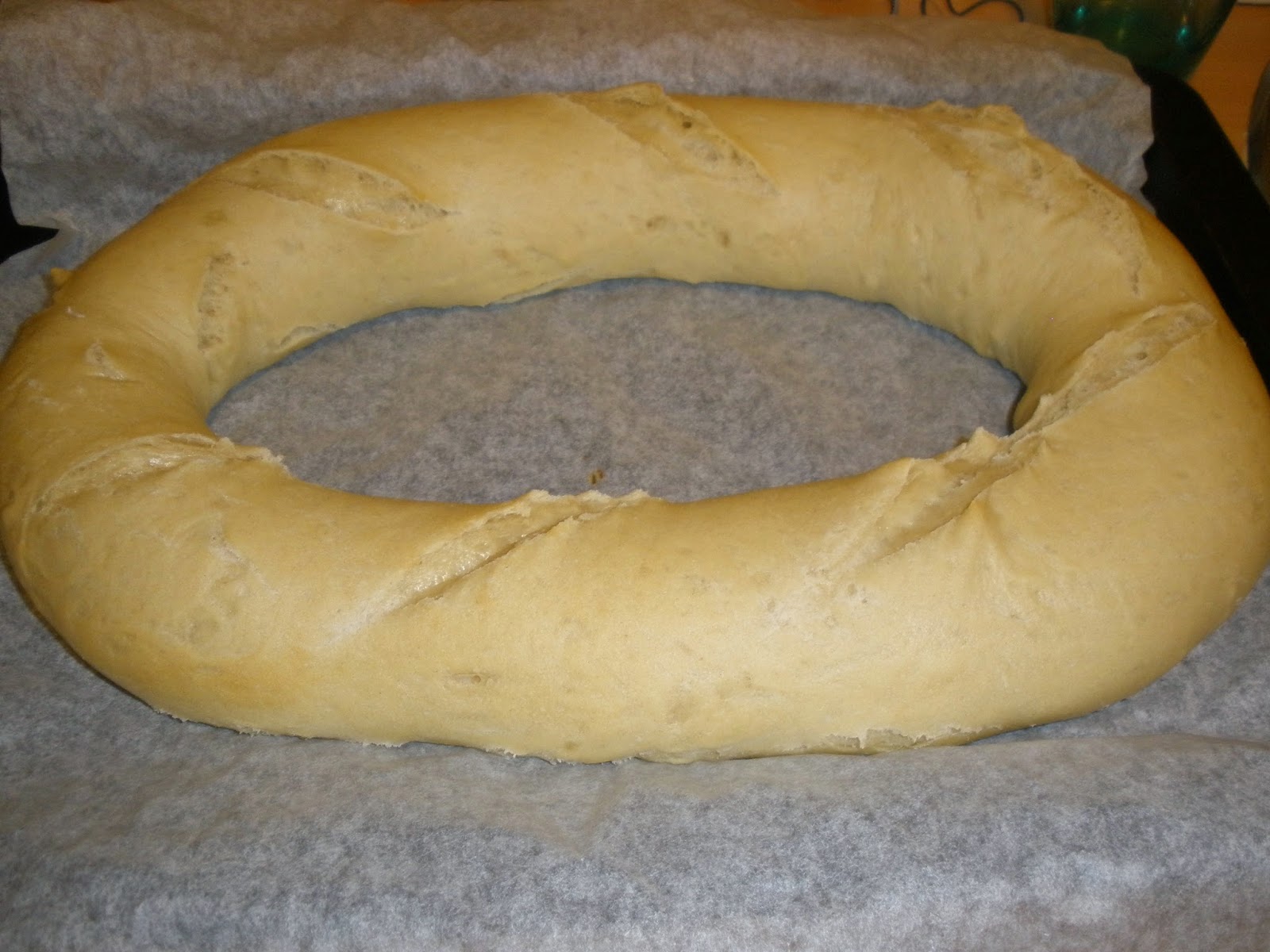 Precalentamos el horno con ventilación y un cuenco con agua en el interior del horno para que gane humedad. Horneamos la rosca a 200º hasta que se dore la superficie del pan.