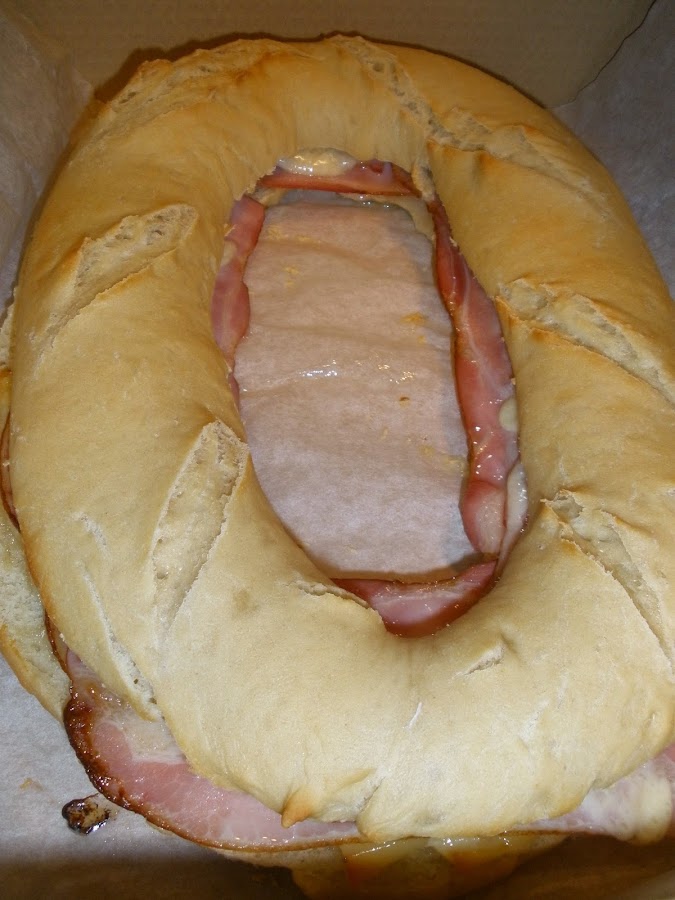 Para rellenar la rosca hay que hornear durante unos 15 minutos y dejar enfriar un poco. Abrimos con un cuchillo de sierra, rellenamos con el queso y el bacon y volvemos a hornear otros 15 minutos aproximadamente.