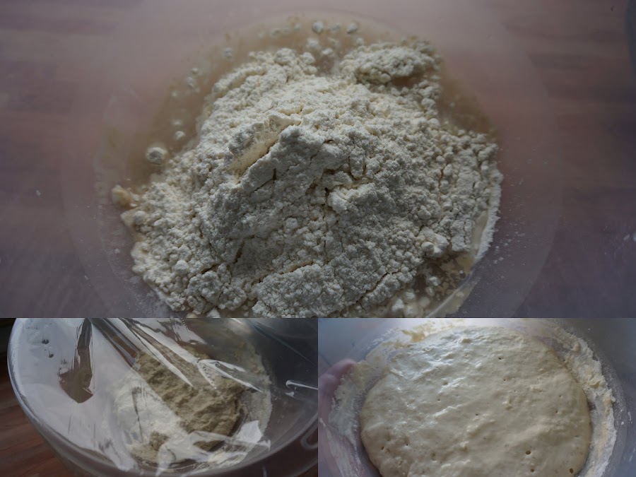 hacer la esponja mezclando sus ingredientes, y dejar descansar tapado con film 30 minutos o hasta que leude al doble o triple