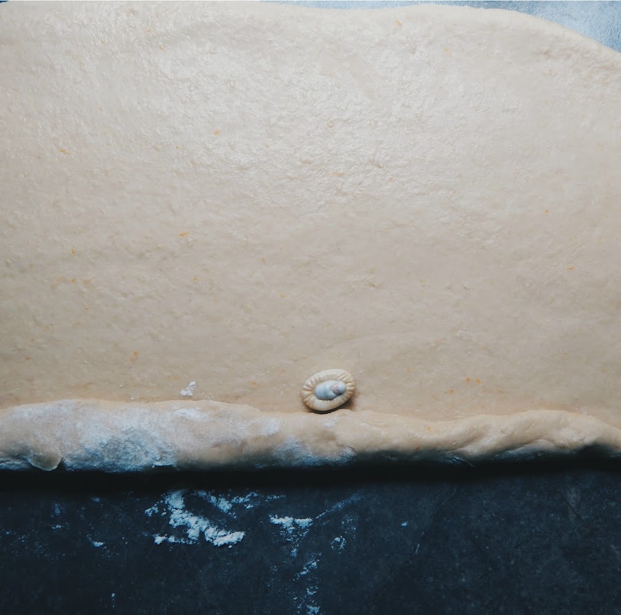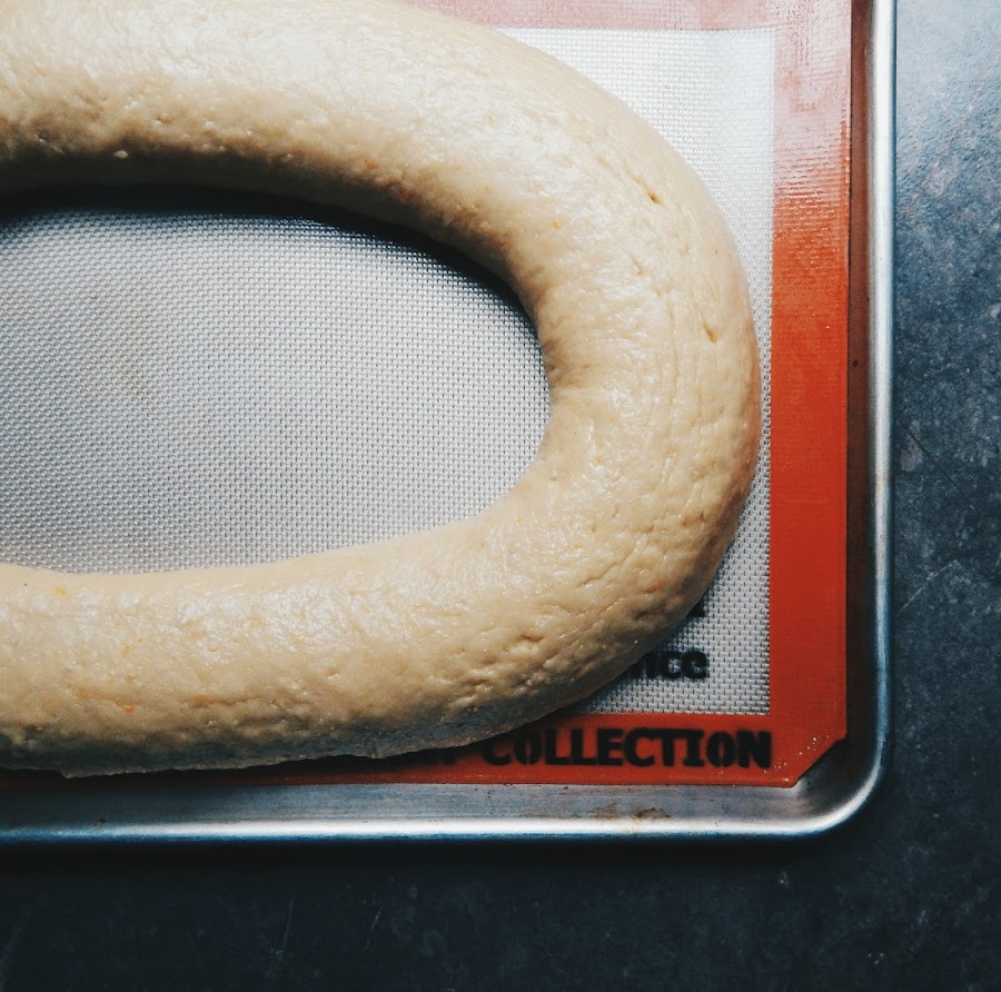 Con mucho cuidado pasamos el rollo a una charola de al menos 30 x 40 cm con papel encerado o un silpat, si se mira la unión de la masa, procuramos que esté en la parte de abajo. Juntamos los extremos del rollo y damos forma a la rosca.
