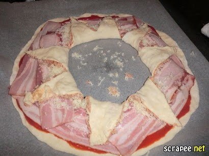 Llegado este punto, cortar las porciones de pizza, sin llegar a los extremos, y recoger del centro hacia afuera. Ha de quedar como en la foto.
