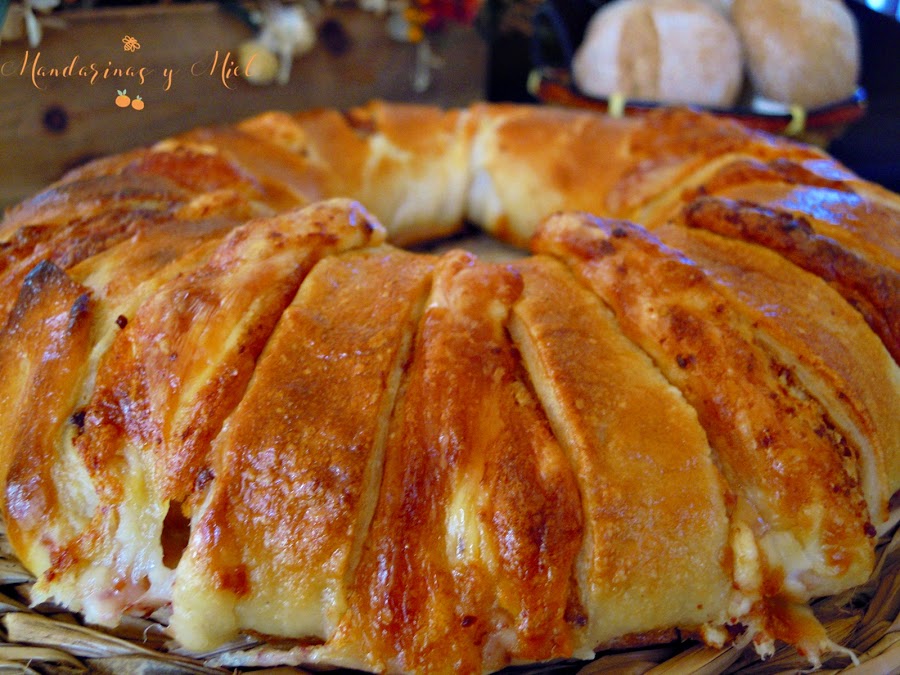 Yo le he hecho unos cortes en la masa antes de hornearla, y como verás en la foto de la rosca recién salida del horno, se ha salido un poco el queso del interior, pero sino quieres que te pase, no los hagas y la cortas después.....aunque tengo que decirte que lo que se sale está riquísimo!!