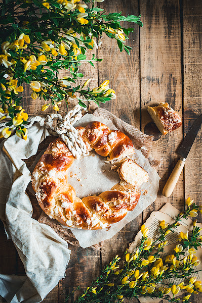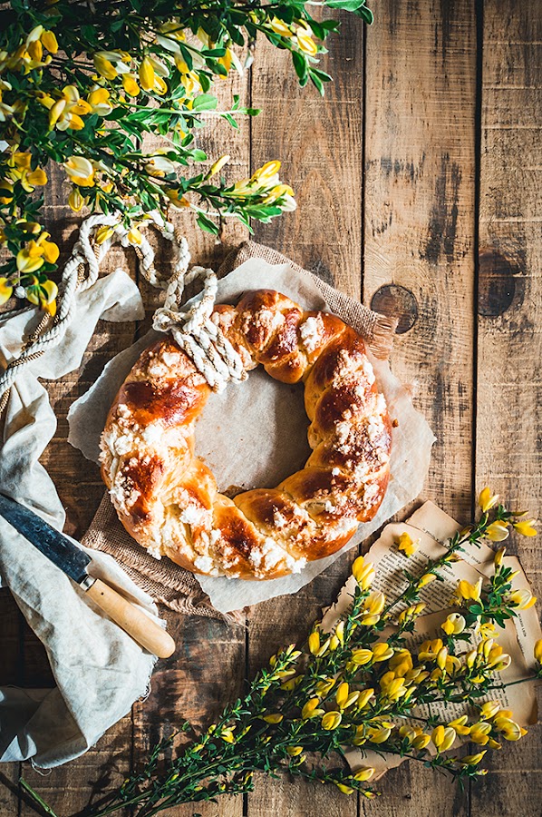 Ojeando el libro de Pam de nuevo, me encontré esta rosca trenzada de Pascua. La verdad que en mi casa no hay tradición de Semana Santa, realmente lo único que nos gusta de la Semana Santa son sus festivos, aunque este año como si no los hubiera! Los dulces nos gustan, eso cae de cajón, jejeje, así que no se le puede decir que no sea en la época que sea.
