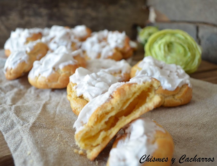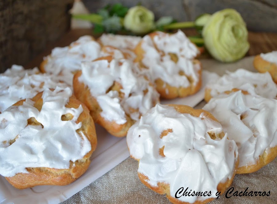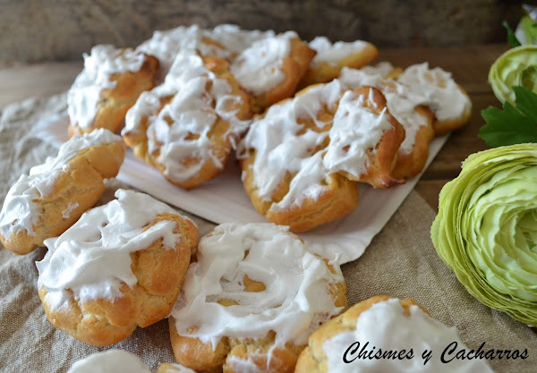 Cubrir una bandeja de horno con papel de hornear, distribuir con una cuchara unos cuantos montones por la bandeja, depende del tamaño saldrán más o menos. Yo puse dos cucharadas en cada montón. Al cocer suben y forman el rosco hueco. Meter al horno que ya estará caliente a 180º calor arriba y abajo y dejar hasta que estén un poco dorados. Sacar y dejar enfriar.