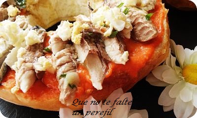 Previamente , tendremos preparado el salmorejo y la rosca. Abre la rosca por la mitad, pon en el pan unas cucharadas generosas de salmorejo, encima coloca los lomos de caballas, pon un poco de sal en escamas y huevos duros picados por encima. Rocía con un chorrito del aceite de las caballas.