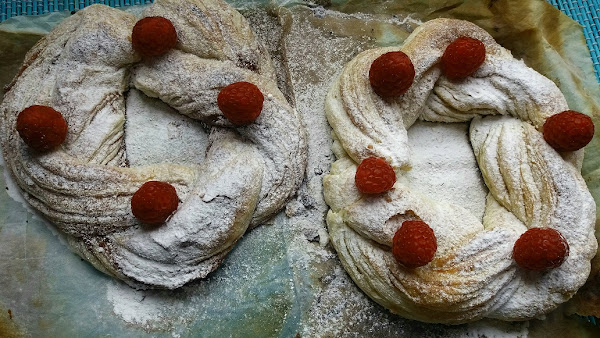 Lo primero que vamos a hacer es precalentar el horno a unos 190º. Mientras se calienta, extendemos la lámina de hojaldre (la ponemos encima del papel que trae para evitar que se nos pegue en la mesa de trabajo). Ponemos azúcar (yo uso azúcar morena) y canela, la cantidad va en gustos. Con un rodillo (o botella, no nos vamos a poner tikismikis a estas alturas), y lo pasamos por todo el hojaldre, apretando un poco para que la canela y el azúcar se incrusten bien en el hojaldre. En la de mermelada, pues extendemos una fina capa de mermelada por todo el rectángulo . Enrollamos de nuevo el hojaldre y con un cuchillo afilado lo cortamos a lo largo sin llegar hasta el final. Ya sólo nos queda ir enrollando las dos tiras que nos han salido y darle forma de corona. Unimos bien los dos extremos y pincelamos con huevo batido. Aquí, si quieres, le puedes poner más azúcar y canela, almendra molida... lo que más te guste. Metemos en el horno y lo dejamos hasta que haya subido y esté dorado, unos 15-20 minutos. Vigilad muy bien, porque el hojaldre se quema enseguida, y cada horno es diferente. Cuando esté listo, lo sacamos, dejamos enfriar y en mi caso, lo espolvoreamos con azúcar glass y adornamos con unas frambuesas... listo para comer!!!