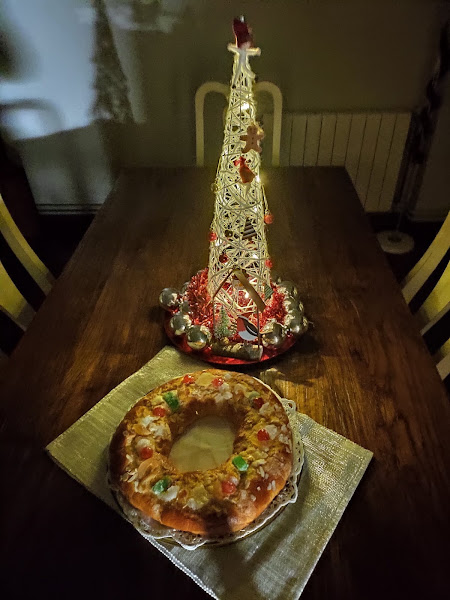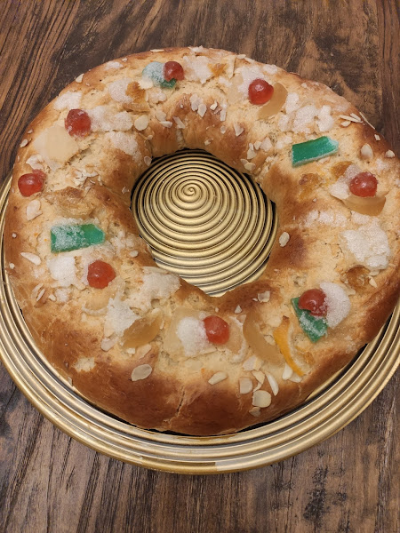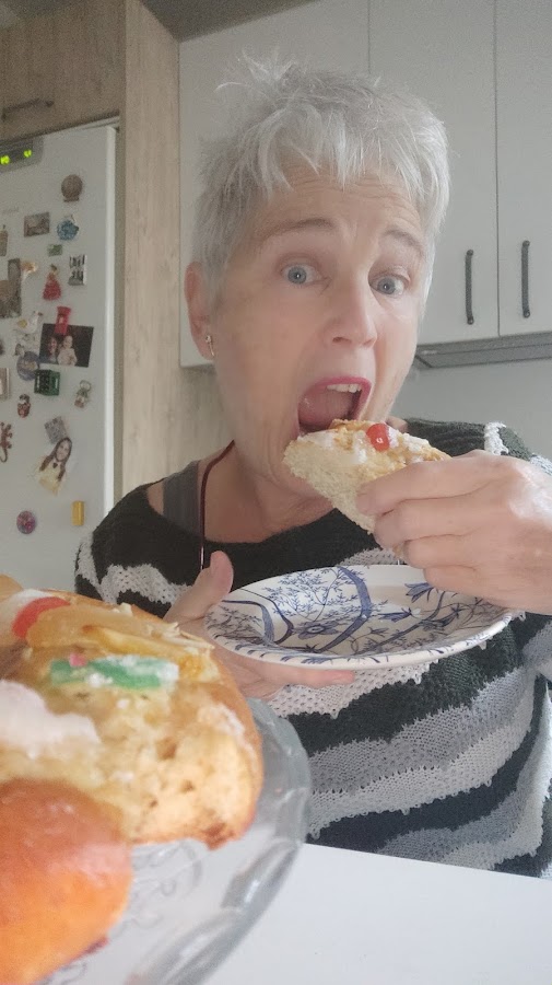 La sacamos, nos ponemos harina en las manos y abrimos un agujero con las manos y vamos formando el roscón. Metemos la sorpresa y pintamos con una mezcla de 1 huevo, más una yema y un poco de leche.