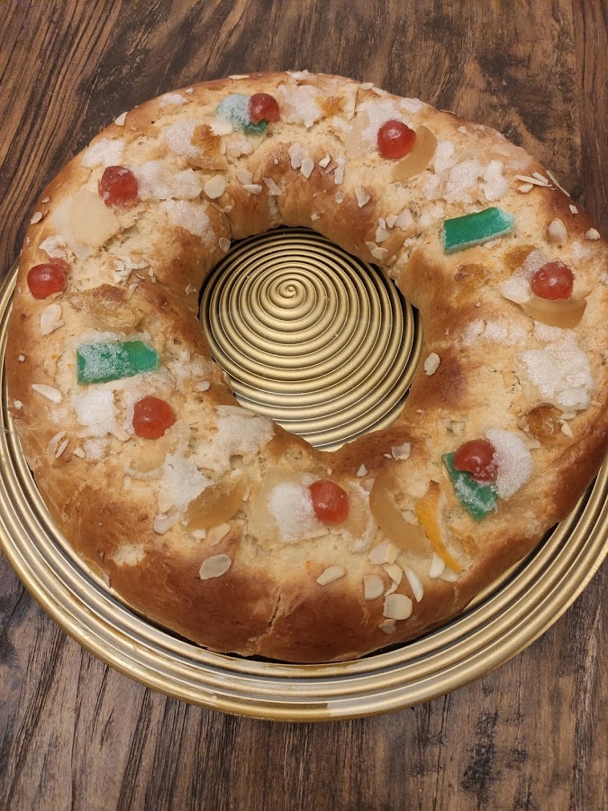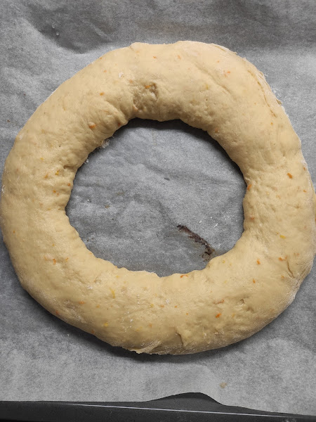Ponemos un papel de horno encima de una bandeja y colocamos el rosco.