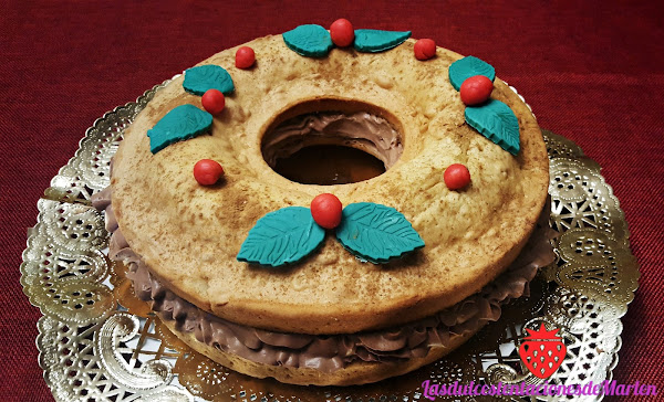 Montar la crema de chocolate reservada en el frigo con varillas electrificas hasta que este bien firme. Pasar la trufa obtenida a una manga pastelera con boquilla ancha y estriada (así quedará mas bonita). Cortar el rosco por la mitad y rellenarla con la trufa.