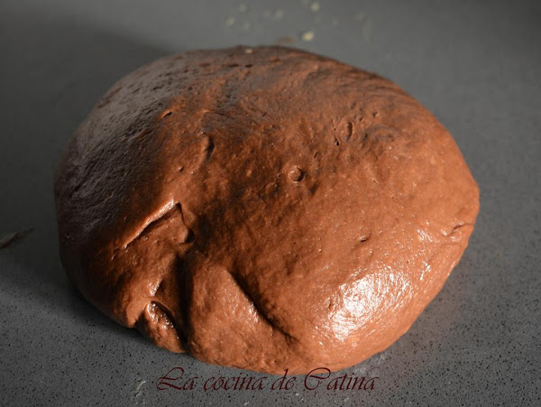 En un bol mezclamos la harina con el cacao, la levadura, los huevos batidos y la infusión de leche. Amasamos con las manos, con una amasadora o con un robot de cocina hasta conseguir una masa elástica y homogénea. Añadimos la mantequilla y amasamso hasta que se integre por completo.
