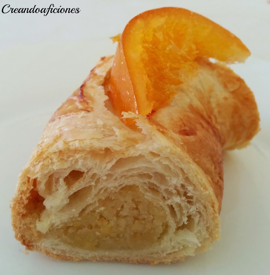 Extendemos la lamina de hojaldre y ponemos el mazapán en el hojaldre lo cerramos y hacemos un circulo y vamos extendiendo hasta hacerlo mas grande, veréis que se puede extender con facilidad, pero tener cuidado que no se rompa. También podéis extenderlo antes de poner el mazapán con un rodillo.