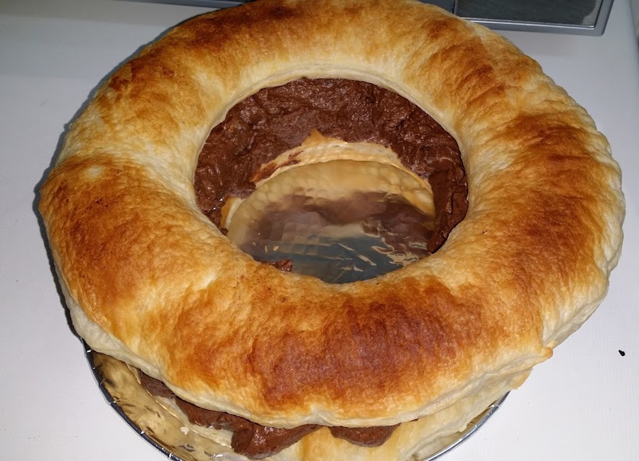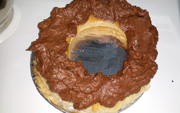 Colocamos un rosco de hojaldre en un plato o bandeja y cubrimos con el chocolate.