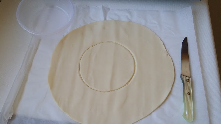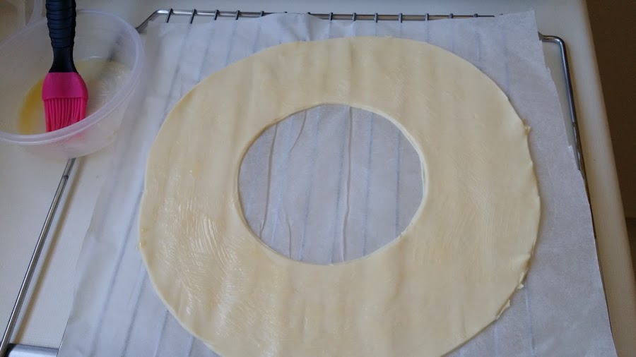Precalentamos el horno a 200ºC y empezamos a dar forma a nuestro roscón. Cortamos un círculo en el centro de la lámina de hojaldre y reservamos.
