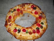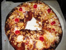 Cortamos la fruta escarchada y se la ponemos al roscón previamente pintado de huevo y lo metemos en el horno para que se haga