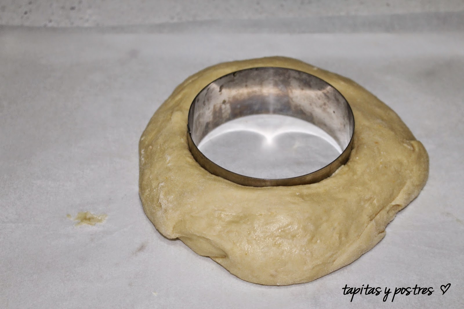 Con la otra mitad hacemos una bola y con los dedos hacemos el agujero del centro, la colocamos sobre una bandeja con papel vegetal y le colocamos un aro en el centro ( ya que cuando sube se cierra un poco).