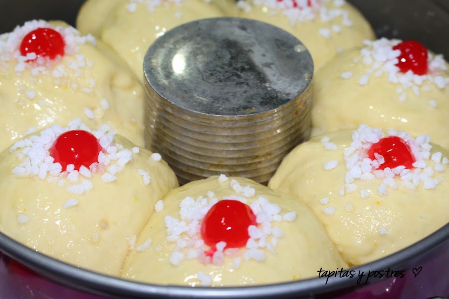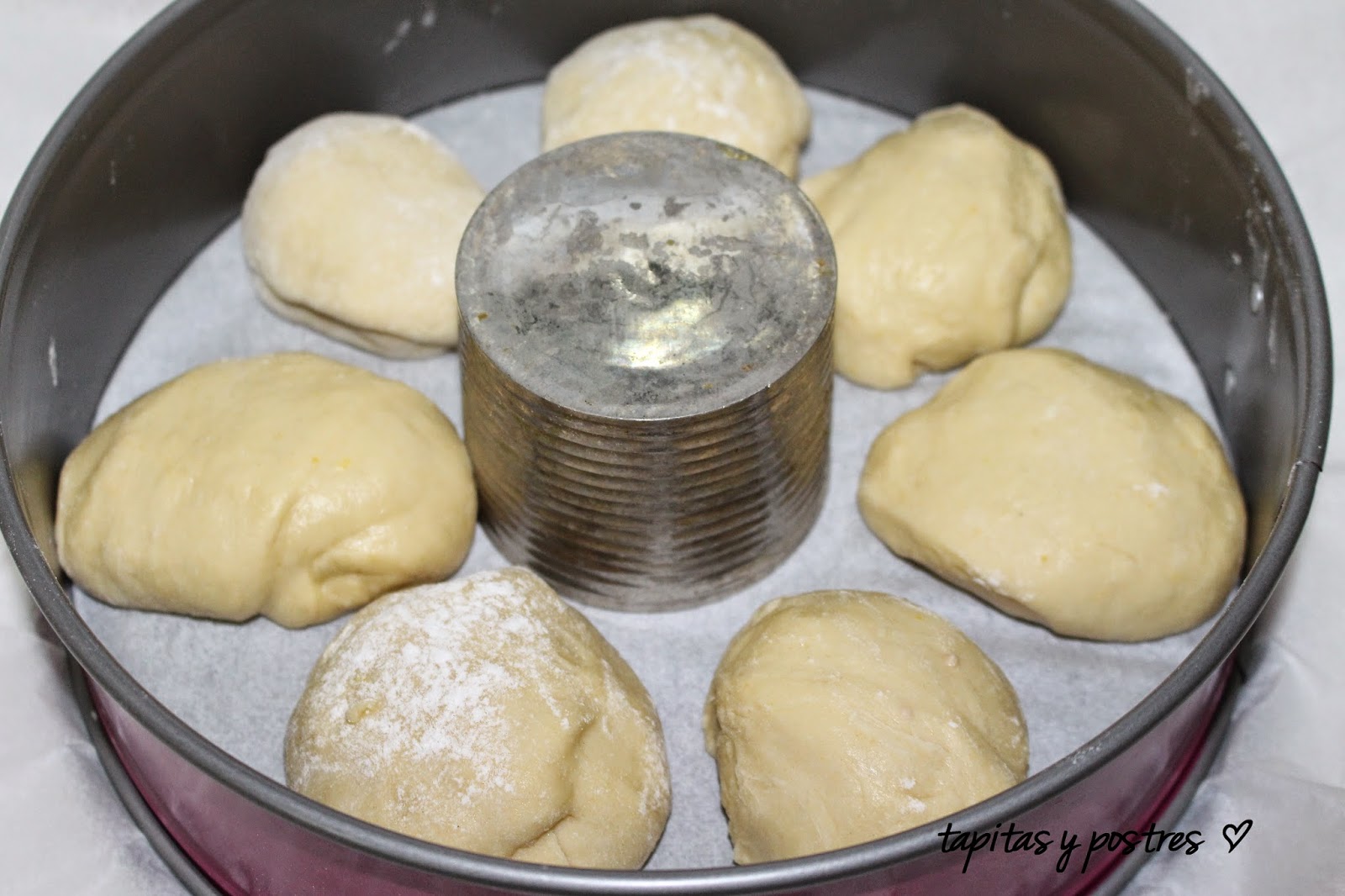 Dividir la masa en dos, una mitad la dividimos a su vez en bolas del mismo tamaño y las colocamos en un molde redondo con un aro en medio. Las dejamos separadas.