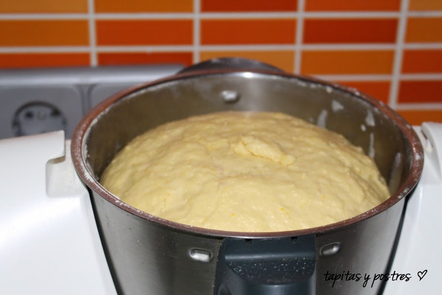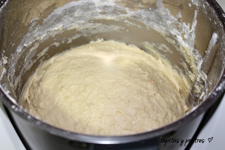 Ponemos en el vaso el azúcar glas aromatizado, los ingredientes de la masa por orden ( leche, mantequilla, huevos, levadura, agua de azahar, zumo de naranja, azúcar invertido, harina de fuerza y sal ) y por último la masa madre. Programamos 30 segundos, velocidad 6. A continuación amasamos programando 5 minutos, vaso cerrado, velocidad espiga. Una vez finalizado el tiempo se deja reposar la masa dentro del vaso hasta que esta salga por el vocal ( aproximadamente 3 horas, esto puede variar dependiendo de la temperatura ambiente)