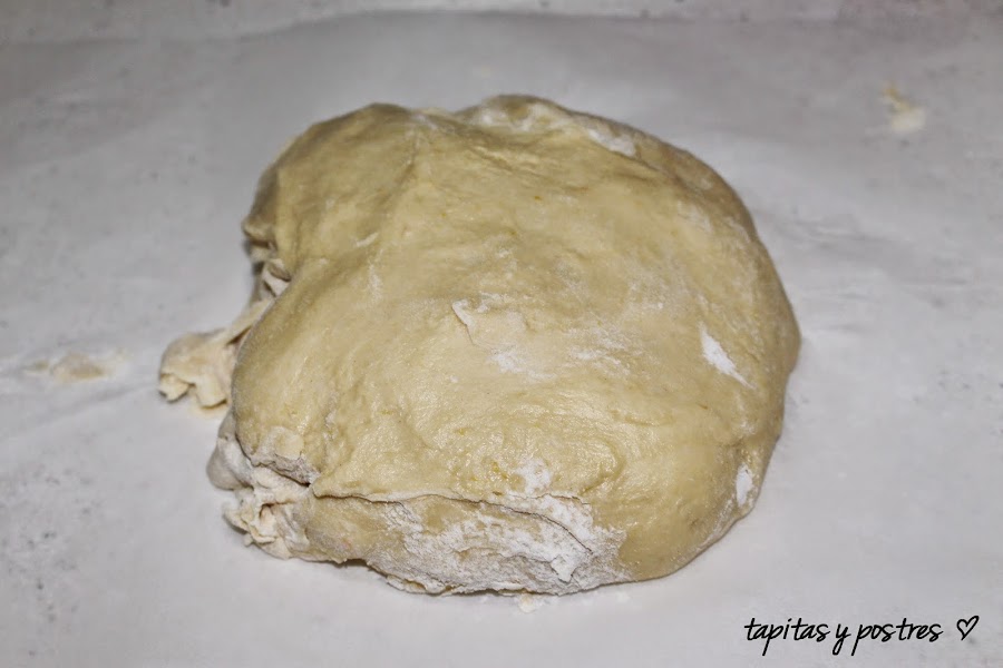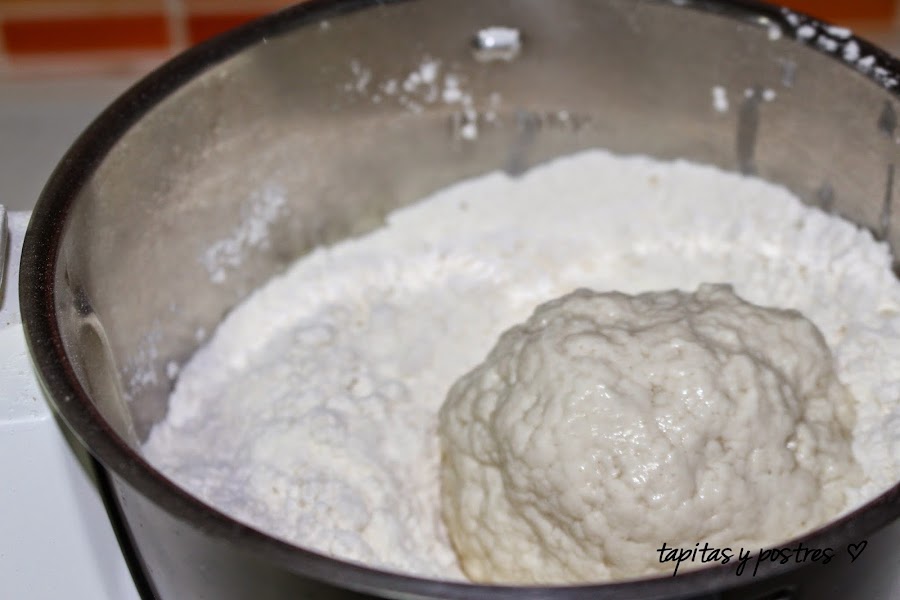 Y damos forma de bola en la encimera, poned algo de harina, es una masa pegajosa pero fácil de trabajar. Hacemos dos partes.