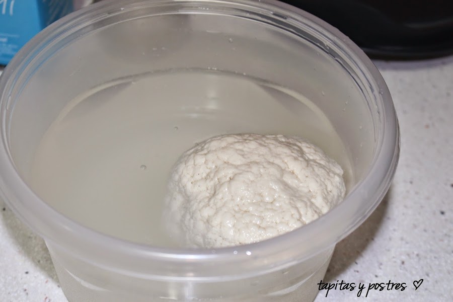 Ponemos en el vaso todos los ingredientes de la masa madre en el mismo orden como esta indicado (leche, levadura, azúcar y harina de fuerza), programamos 15 segundos, velocidad 4 Retiramos del vaso y formamos una bola sobre la encimera. Dejamos en un bol y cubrimos con agua templada. Cuando flote (unos 15 minutos) y haya doblado su volumen ya estará lista.