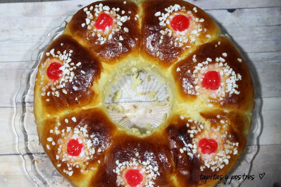 Este año he querido dar otra forma al roscón, saliéndome de la forma tradicional porque era para regalar y poniendo azúcar perlado que encontré en el mercado y ha quedado muy bonito.