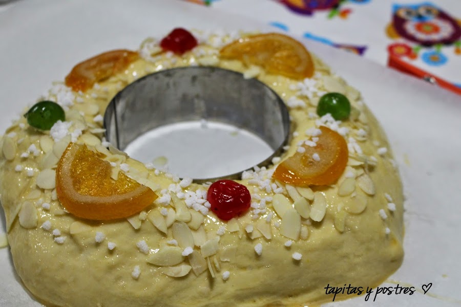 Y al tradicional, frutas escarchadas, almendras laminadas y azúcar perlada. Si no tenéis azúcar perlada, podéis hacer azúcar humedecida con una gotas de agua, no es lo mismo pero es lo que casi todos los roscones llevan.Ahora al horno, 180º, unos 25 minutos. Calor arriba y abajo sin ventilador.