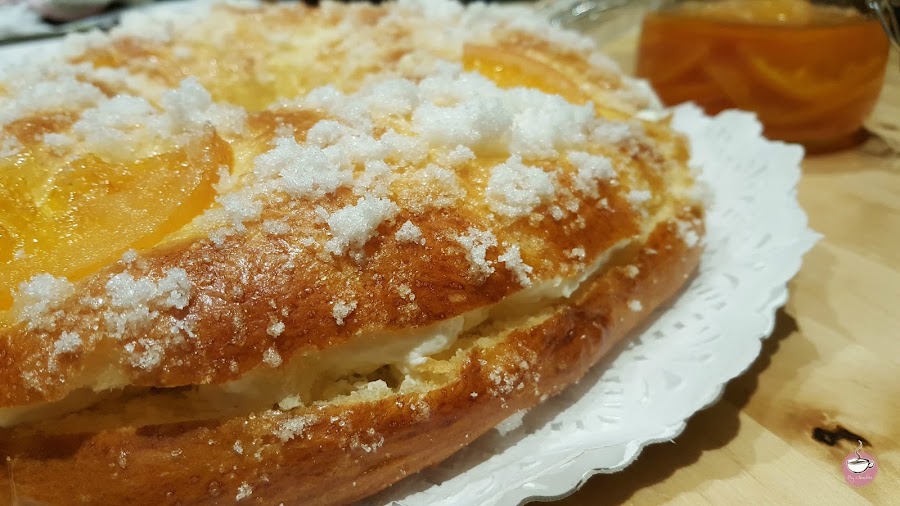 Pincelamos de nuevo los roscones con huevo batido y decoramos con naranja confitada y azúcar humedecido con agua de azahar. Bajamos la temperatura del horno a 180º y horneamos durante 15 minutos con calor arriba y abajo y sin aire. Vigiladlos para que no se os quemen.