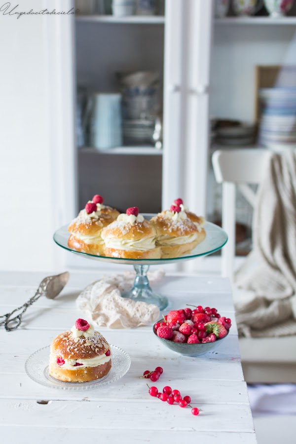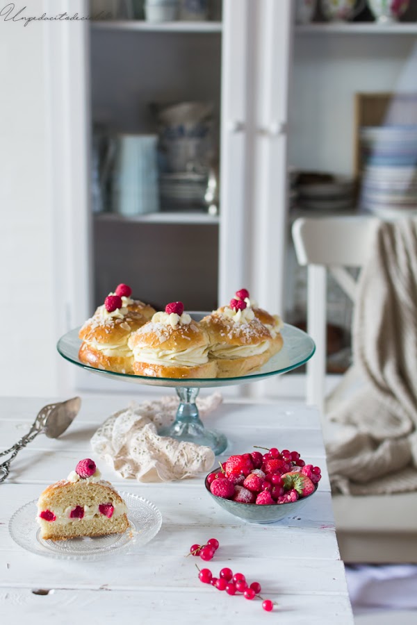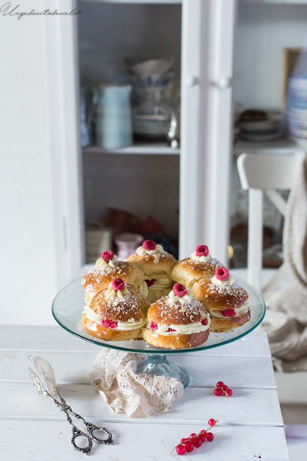 Una vez frio lo abrimos con un cuchillo para pan y lo rellenamos poniendo la crema en una manga y una boquilla de estrella con todo el arte del mundo y luego ponemos frambuesas a nuestro gusto.