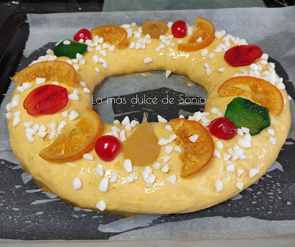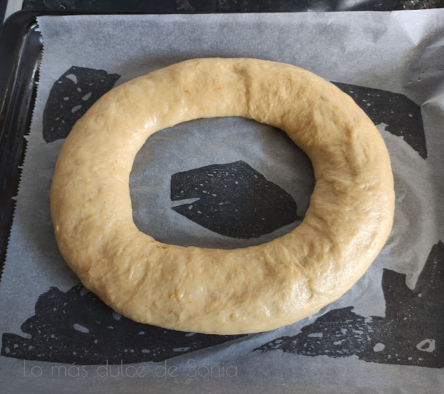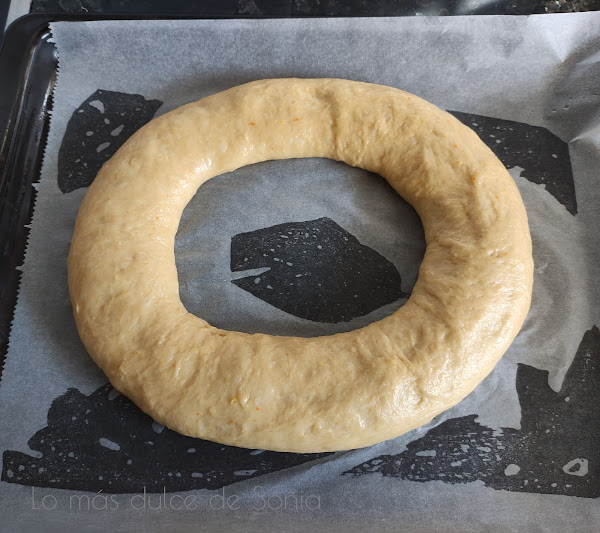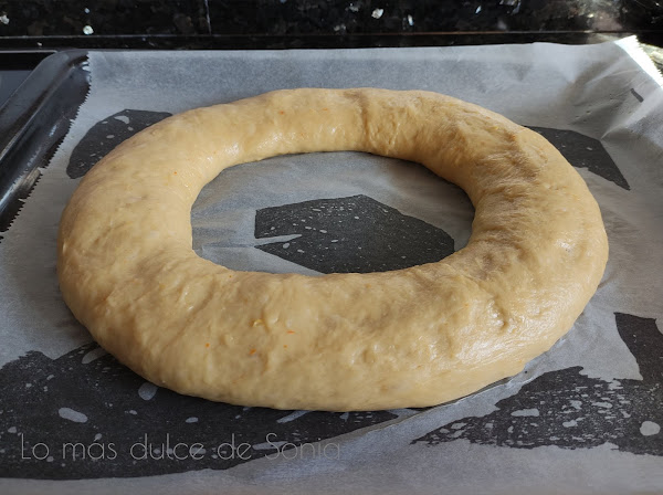 Hacemos una bola con la masa, metemos dos dedos en el centro y vamos haciendo en agujero. Puedes hacer uno grande o dos más pequeños. Pincelamos muy bien con huevo batido , cubrimos con papel film y dejamos que vuelva a levar, tiene que doblar su volumen.